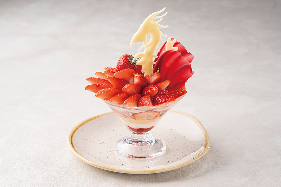 大海原を突き進むドラゴンをイメージした苺尽くしのパフェです。厳選したイチゴをふんだんに使用し、自家製苺ジャムとカスタードクリーム、北海道産の生クリームにキルシュ酒のゼリーでアクセントを加え仕上げました。
