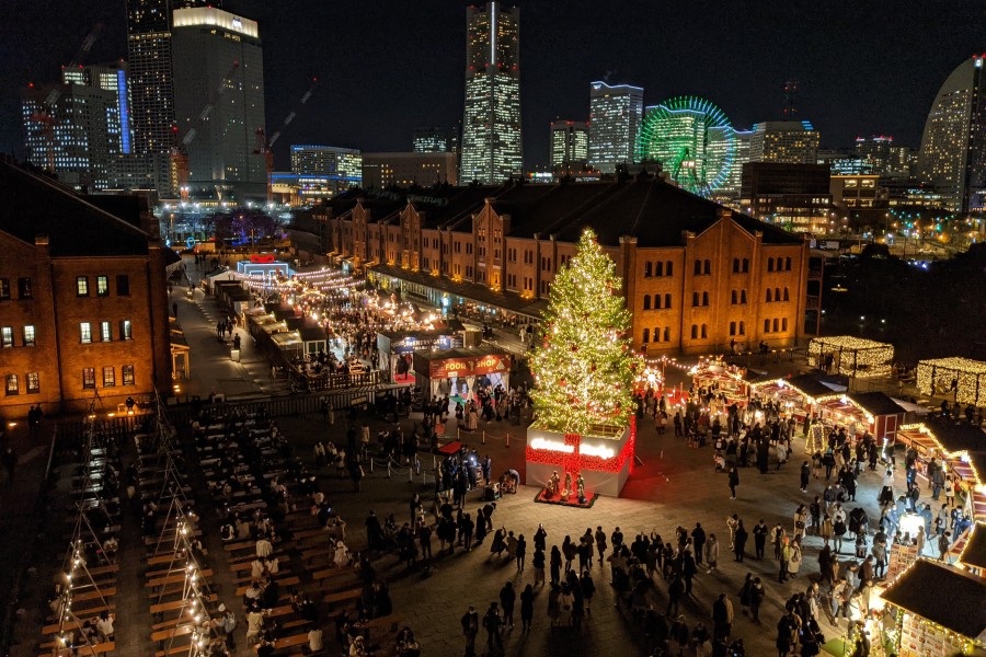 みなとみらいの近代的な街並みと海を臨む横浜赤レンガ倉庫に、クリスマスマーケット発祥の地、ドイツの世界観が表現された「Christmas Market in 横浜赤レンガ倉庫」。